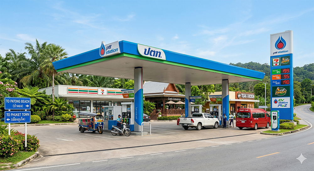 Most gasoline-powered cars use 91, 95, or E20 gasoline. The recommended fuel type is usually indicated on stickers on the back of the fuel filler flap or on a sticker behind the driver's door. To be 100% sure you're using the correct fuel, ask the rental company for this information. The fuel type is also specified in the rental agreement. Typically, cars are delivered with a full tank, but if not, research the location of the nearest gas stations in advance. Gas stations in Phuket are mostly located on main roads; they're rare in tourist areas; you can find them on Google Maps. A 24-hour gas station is rare; try to fill up early during the day, as nearby stations are likely to be closed in the evening and especially at night. There are several 24-hour gas stations on the island, one of which is located on the main Thepkrassatri Road near the airport. Google Maps shows the opening hours of each station. To fill up your car, you don't need to leave it. Just tell the employee the type of fuel, the number of liters, or the amount, and hand the money to the attendant through the window. He'll do the rest.