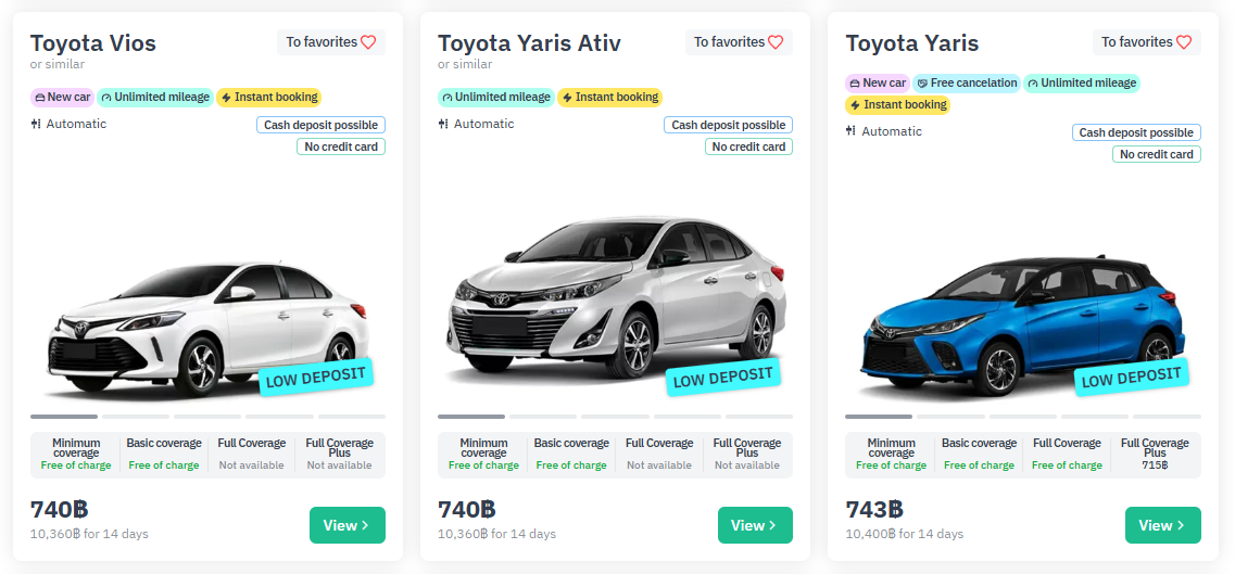 The range of cars available for rent in Phuket begins with the standard class. These include simple, budget-friendly compact sedans and hatchbacks from Toyota and Honda, while less frequently, rental companies offer a choice of Mazda, Nissan, Suzuki, and Mitsubishi. The standard class includes cars such as the Toyota Vios, Toyota Ativ, and Yaris, Nissan Almera, Honda Jazz, Honda City, Nissan March (aka Micra), Mazda 2, Suzuki Swift, and Mitsubishi Mirage and Attrage. All these cars have roughly the same dimensions, are equipped with automatic transmissions, and differ only in appearance. Entry-level rental cars typically have 1.2-1.5-liter engines, while hatchbacks often have 1.2-liter engines. However, there are exceptions: the Nissan Almera and Toyota Yaris Ativ also have 1.2-liter engines despite being sedans, while the Honda Jazz hatchback has a 1.5-liter engine. Economy class seats five people, including the driver, and luggage compartments vary across models. Quotes you receive through Sabai Motors indicate trunk capacity, and there's even a volume calculator to help you calculate the capacity of a particular car.